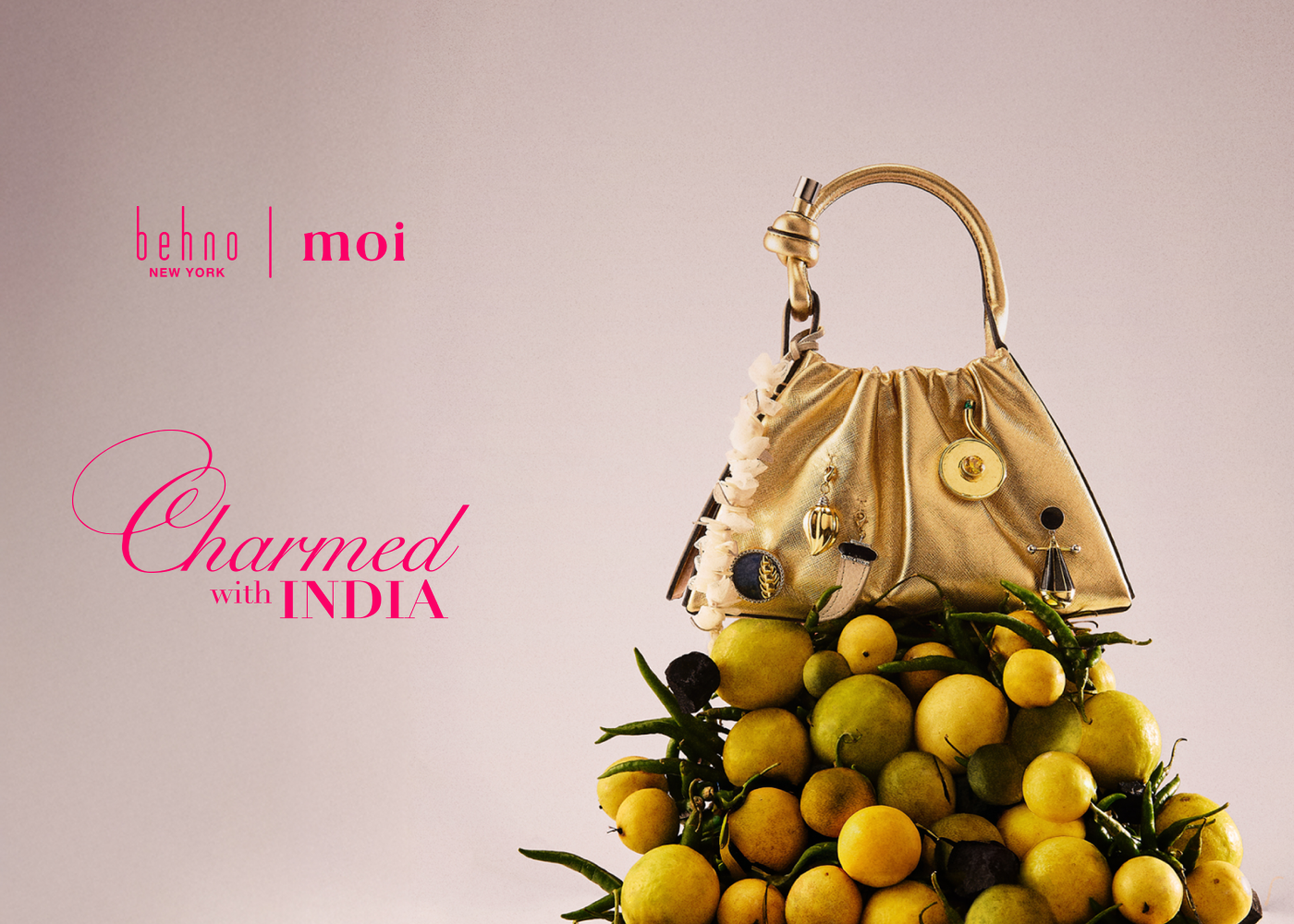 Celebrating the duality of culture and modernity of our roots, this collaboration draws inspiration from Indian symbols associated with prosperity and protection. The collection features bags designed with crafted bag charms that seamlessly transform into wearable jewels.