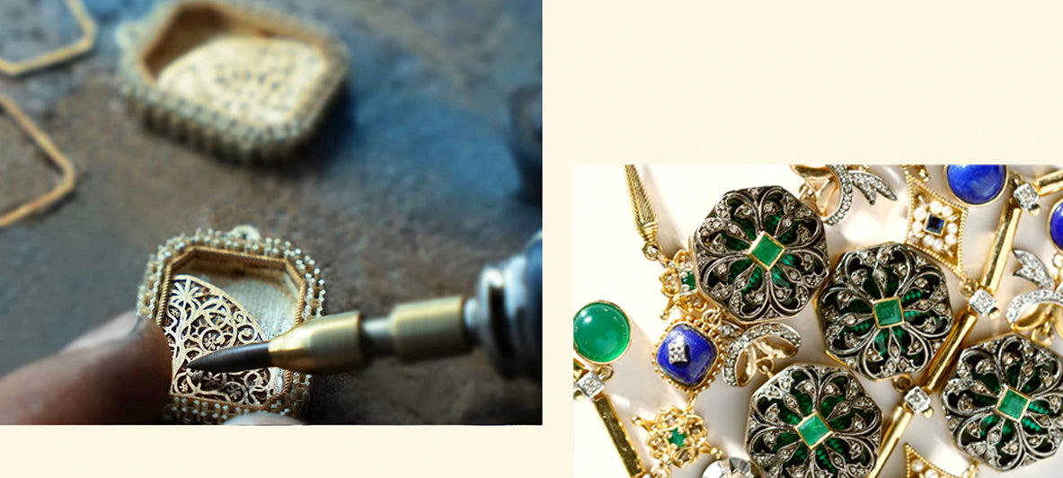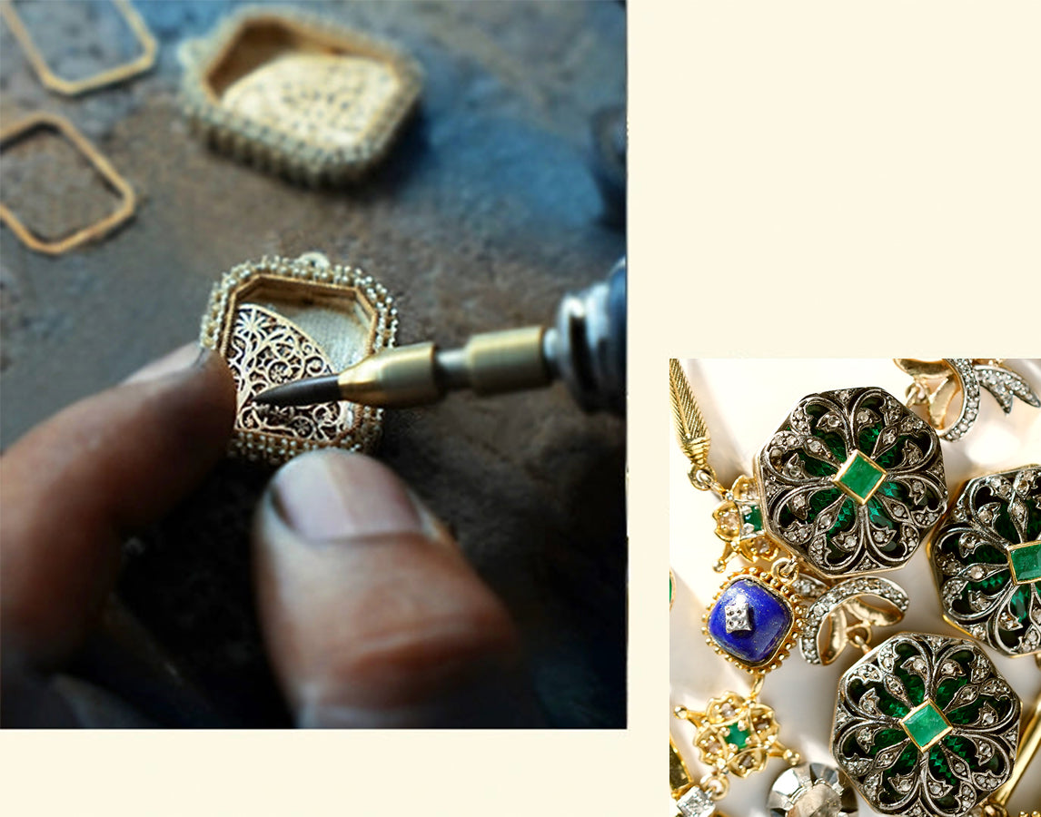 India, with its rich tradition of design and jewelry-making, is our core influence. The vivid colors of gemstones, the varied array of techniques, and the diverse cultural mores and experiences that India has to offer are the backbone of what we do. Our designs translate these into the global reality of today for customers across the world. This is fine jewelry that is effortless. It invokes joy and confidence.