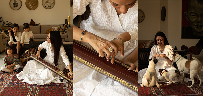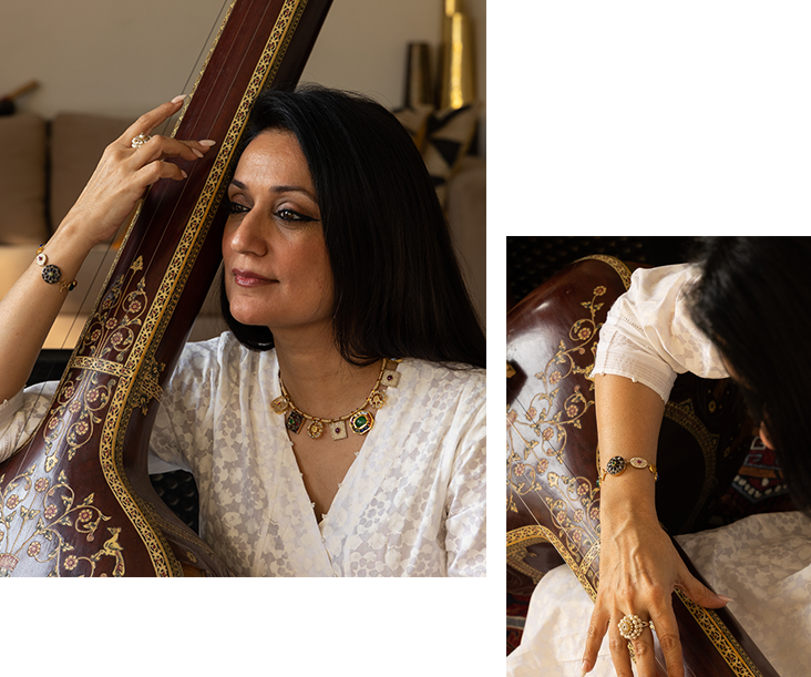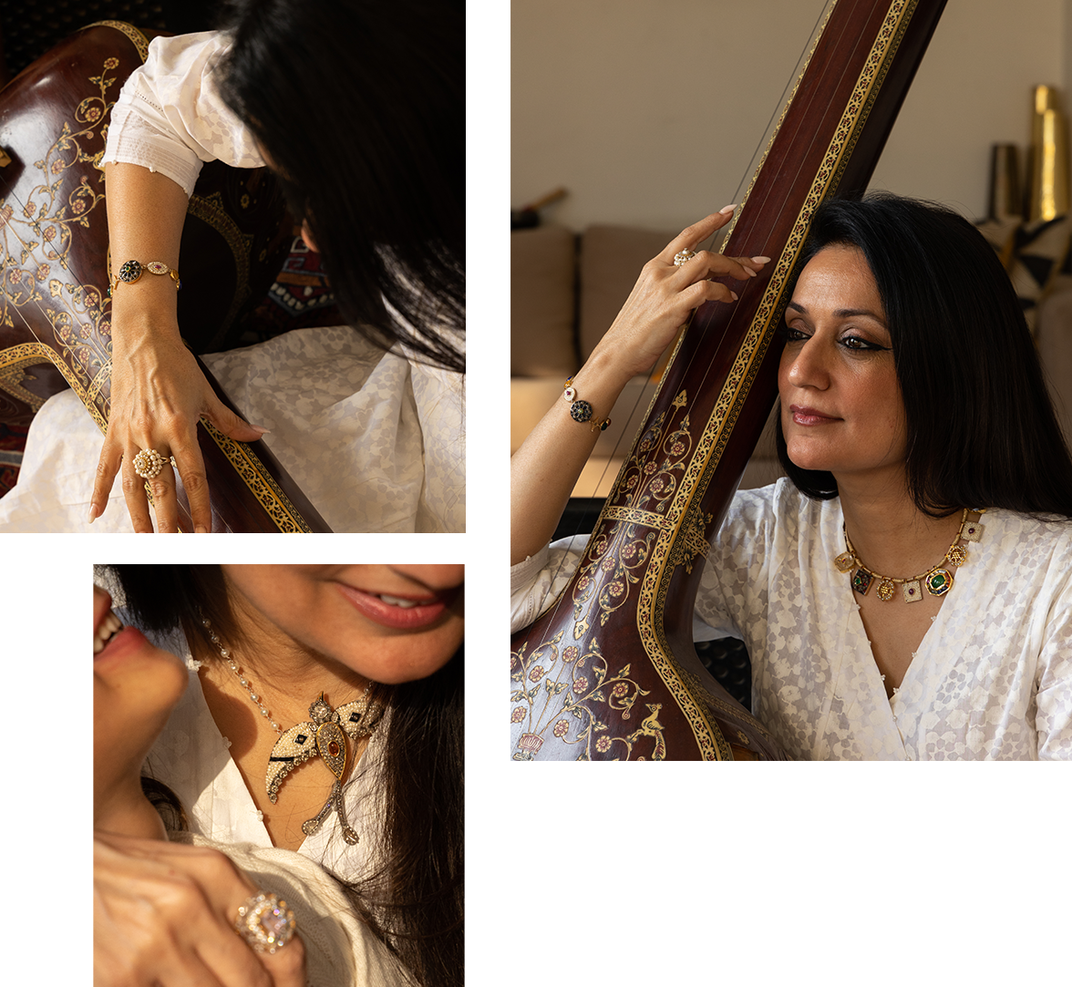 S - For me, every piece of jewelry has a memory attached to it. Jewelry is more than just adornment; it’s a keepsake, a personal memory that you share with the jewelry. Each piece has a story. The necklace I wore at my wedding, which belonged to my mother and grandmother before her, holds a special place in my heart. The pieces of jewelry I wear when I perform, the beautiful maang teeka my sisters gave me when I had my firstborn - Noor, the ring I bought from Sydney after I performed at the Sydney Opera House, and the first earrings that my two girls wore – simple gold studs but so special – all tell a story. Jewellery tells a story of ancestry, of lives lived, of love, of loving, of weaving a connection between generations, and of telling your own story through the jewellery you wear.