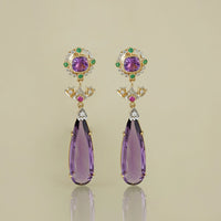 Handcrafted in gold and exuberating a spirit of festive celebration in an elevated silhouette, the Dakota ring strikes a brilliant balance between the elaborate and understated. A visual delight, it holds a faceted amethyst at its heart adorned by a halo of glistening pavé-set natural diamonds and emeralds. It has a surprising detail of the shank channel set with emeralds peeking on the sides.