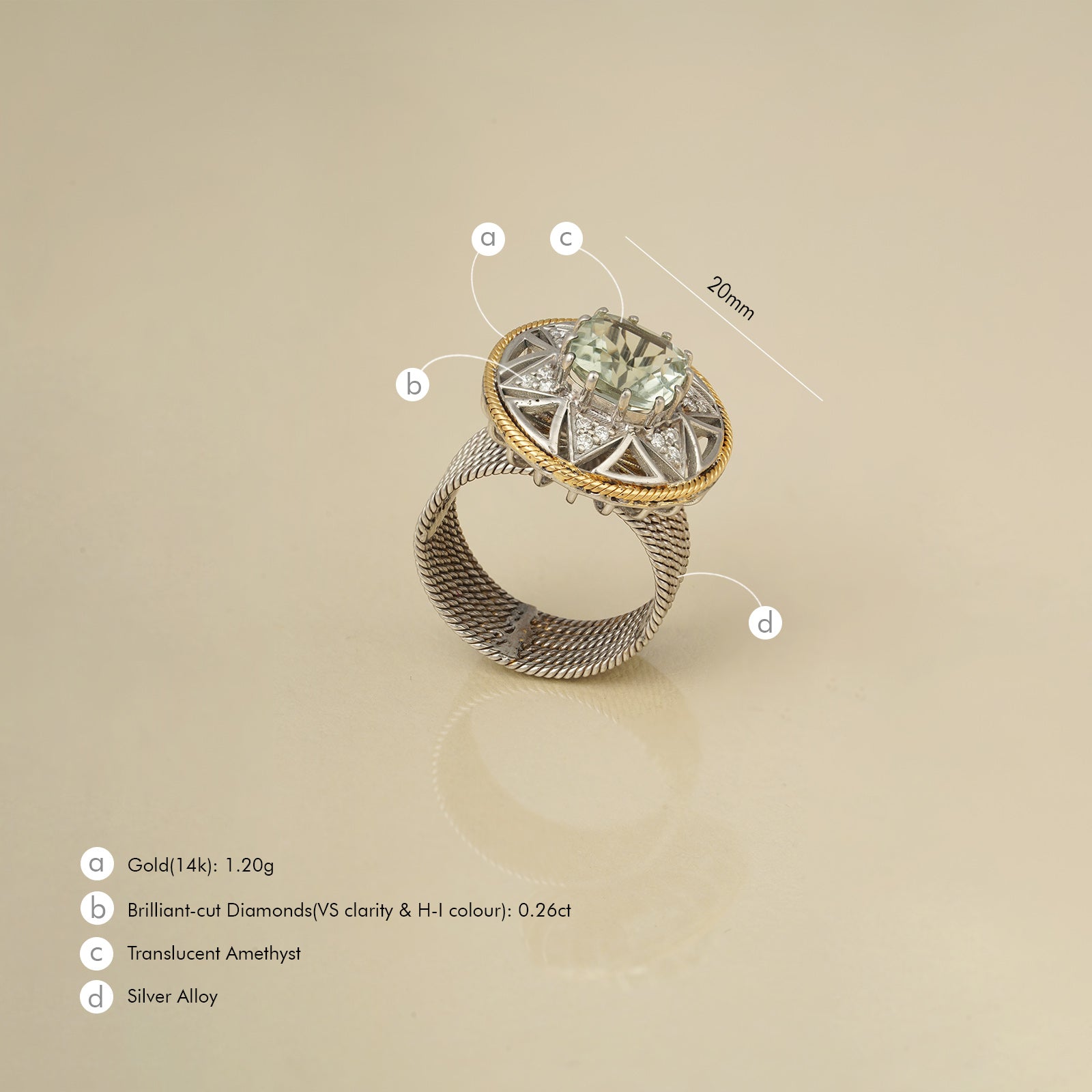 Color being the centre of the design here, this ring boasts of a translucent green amethyst at its heart held by prongs, surrounding it are six triangular elements with pave set natural diamonds encircled by a gold halo. The band of the ring is worked in pure silver with a twisted wire texture on it.
