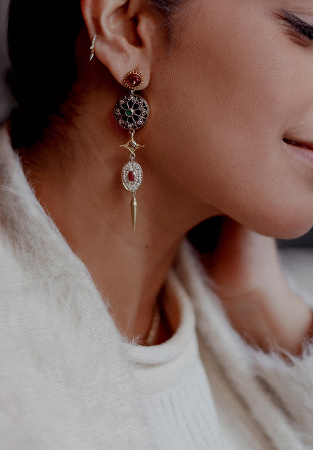 Exploring iconic forms, coupled with a few carefully curated new and old handcrafted techniques, our collection of earrings worked in gold and natural gemstones, is meant to stay. From day-to-day elegant essentials, to the more ornate designs, this range of earrings will take you through every facet of your life!