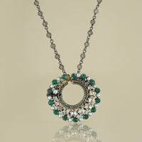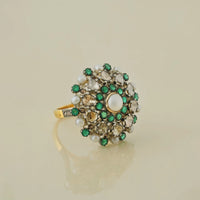Worked in a beautifully unique play of silver and gold, Soha features four concentric circles, with the innermost circle dressed in pave'-set natural rose-cut diamonds, followed by a circle of twisted gold wire. Then follows a circle of natural uncut diamonds set in an open claw setting (Pachchikam) and finally a circle of alternating pearls and emeralds.