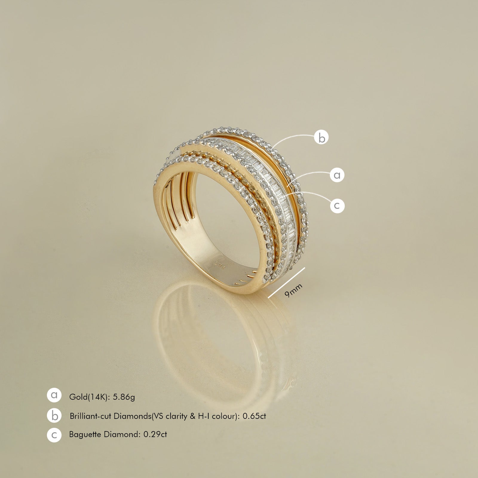 Everyone needs a natural diamond ring that stands by them on all days and occasions. This five-line ring, handcrafted in gold with natural baguette and brilliant cut diamonds is just that! A timeless design that will never run out of style.