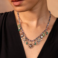 The Sana Bracelet elegantly combines sophistication and artistry, featuring six handcrafted charms set with natural uncut diamonds, emeralds, pearls, cat’s eye, and enamel detailing.