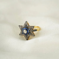 The earrings are handcrafted in a unique play of silver and gold, with silver taking the front stage and gold in an intricately designed back. Pavé-set natural rose-cut diamonds and blue sapphires surround the natural uncut diamond (polki), which lies at the heart of the star. It is suspended from a rhombic top, dressed in a single rose-cut bordered by bright blue enamel work.