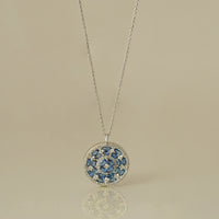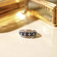 Like your two little personal suns, the Phoebe earrings are an elegant juxtaposition of the deep hue of the blue sapphire with the white of evenly interspersed natural brilliant-cut diamonds. This gorgeous ring is bordered by pave-set natural diamonds, a shimmering halo of twilight.