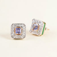 India-inspired, this ring is an ode to the colorful land of India with its iconic blue and green hues. The design is worked in gold and diamonds with a tanzanite set at the heart and a surprising detail of the shank channel set in emeralds, peeking on the sides.