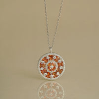 Like your two little personal suns, the Phoebe earrings are an elegant juxtaposition of the vivid hue of the orange sapphire with the white of evenly interspersed natural brilliant-cut diamonds. Enclosed in rings of natural pave-set diamonds, this gorgeous ring is bound to add a little extra 'sunny' to your day!