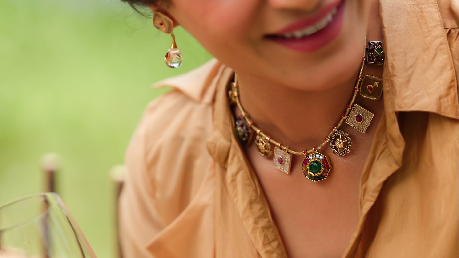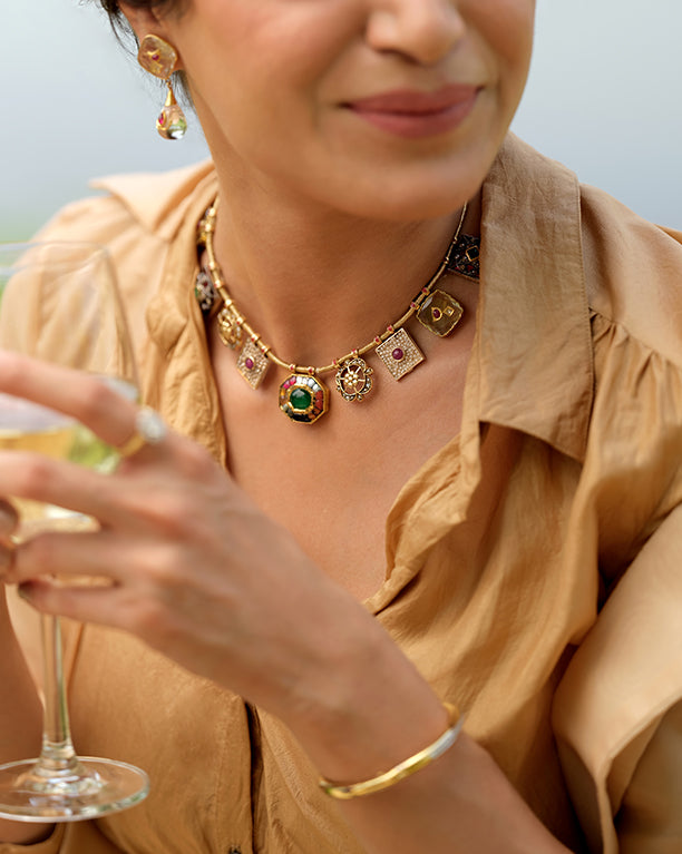 Designed for special occasions, the collection offers statement pieces that will take you from a quiet sundowner, a bold cocktail evening to a fusion wedding. It features multiple traditional Indian techniques like Kundan setting, Meenakari (enameling), and stone inlay, all of which come together harmoniously to paint a picture depicting the essence of celebration.