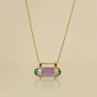 Modern and eclectic, A purple amethyst, cut to resemble a crystal, is suspended from a diamond-set Natural Brilliant-cut diamonds add a hint of . . . Read More