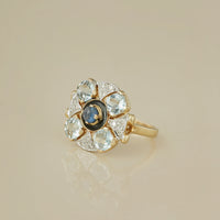 Inspired by Zaha Hadid's style to liberate architectural geometry, giving it a whole new expressive identity, in this pair of earrings, we tried our hands at working with geometrical forms but give it a fluid aesthetic, the choice of water like blue topaz, a modern floral form, diamonds mounted on a base of gold and a blue sapphir added to that. This drop unit is gracefully connected to the top through units embellished with diamonds, infusing a subtle hint of opulence.