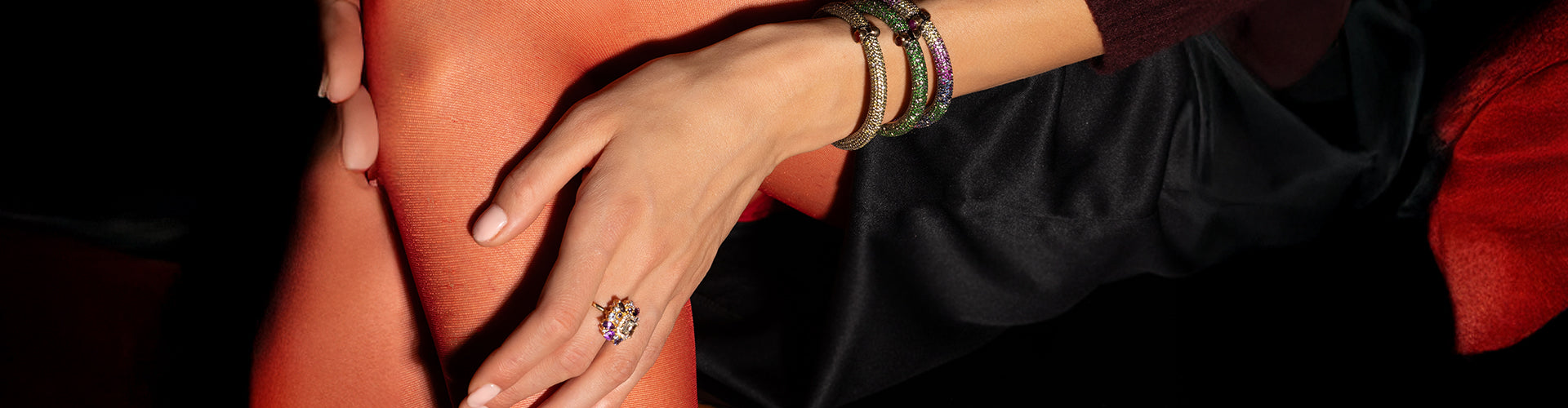 Born from late nights and city lights, each piece is crafted to catch light and steal glances. Rich hues, velvet sparkle, silhouettes that sit on the skin like a secret. Golden citrines, midnight sapphires, enamel shine chokers, necklaces, cocktail rings, bracelets that move when you do. Nostalgia meets now.