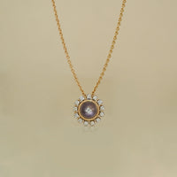Pretty and petite, Zoe hits the sweet spot between modern and timeless. The ring holds an exotic grey freshwater pearl pierced with bezel-set natural diamond and surrounded by a halo of more natural brilliant-cut diamonds. The pearl is placed on top of an intricately carved shank that adds to the overall beauty of the ring.