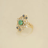 Gleaming and graceful, the Raha Earrings remind us of festivities in fairytales-be it the grand ball in Cinderella or the jubilant entry of 'Prince Ali' in Aladdin and the Wonderful Lamp. Crafted in gold, the earrings are dressed in Natural diamonds all over with hints of sapphires and pearls. At its heart a gorgeous faceted emerald. An emerald top with a push-back closure brings the earring together.