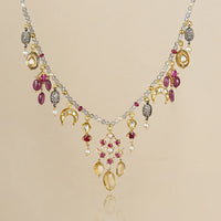 Worked in a beautiful play of old and new, these earrings are handcrafted in gold and dressed in rubies and pearls. Romantic and elegant, Leena earrings remind us of the narrow lanes of quaint bazaars bustling with gilded trinkets, intricate porcelain, and artifacts that have witnessed centuries pass by.
