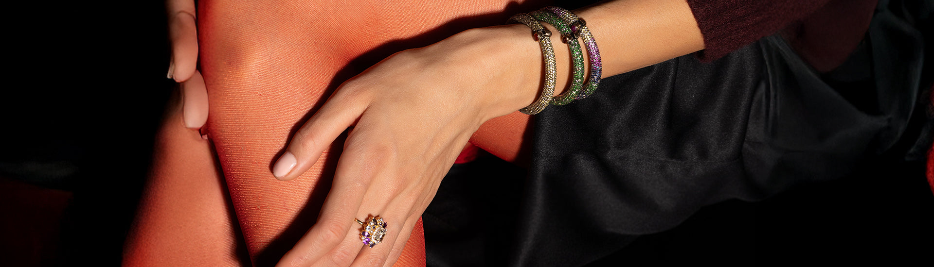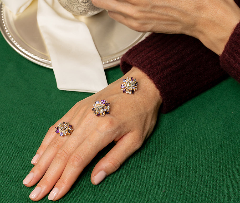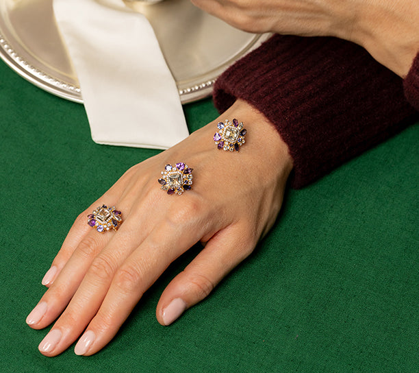 Golden citrines, midnight sapphires, enamel shine necklaces, cocktail rings, bracelets that move when you do. Nostalgia meets now. Styled with satin, sheer dots, berry tones the click of metal, the last swipe of gloss, the whisper of silk before the door opens. Life of the Party isn’t about being seen. It’s about being unforgettable.