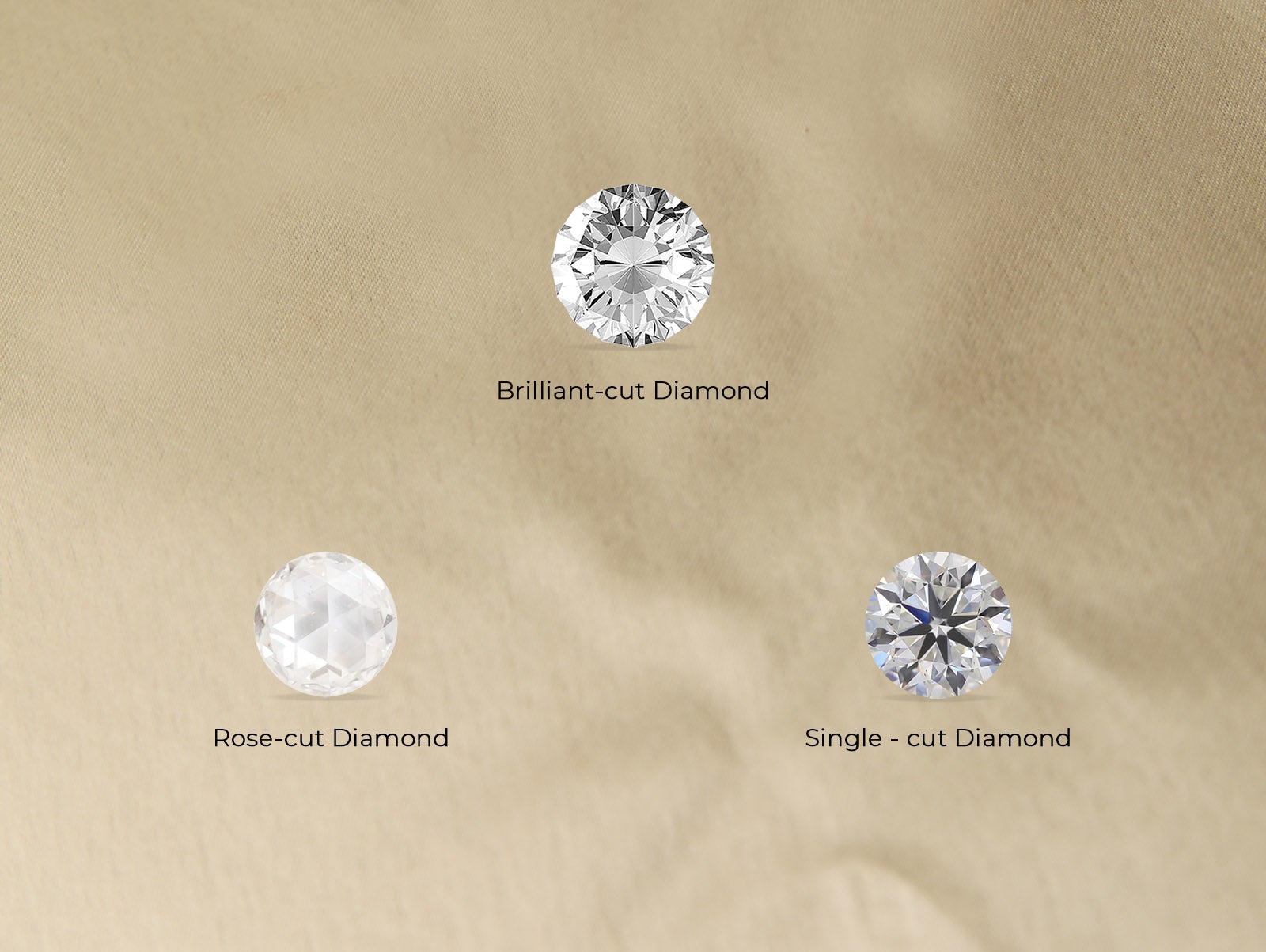 Single - cut Diamond : Also called “Melee” diamonds, these are cut as round brilliants but have fewer than the standard 57 or 58 of facets are referred to as “single cut”.