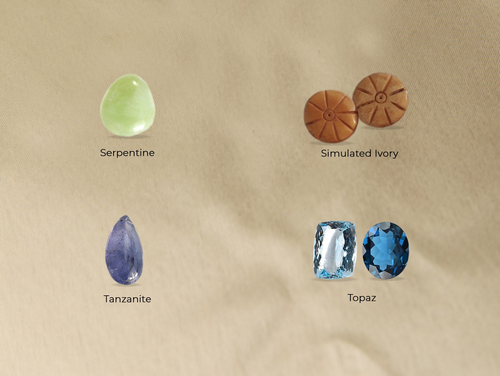 Simulated Ivory : A man-made gemstone created with a compound of minerals to make the gemstone look and feel like Ivory.