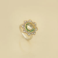 Like magical flowers plucked from Frances Burnett's Secret Garden, each stud of this ring pair features an eight-petalled flower surrounding a gorgeous, round-cut green amethyst, bordered by a halo of alternating emerald. The sparkle of the petals is owing to the pavé-set natural Brilliant-cut diamonds. Want to know secret behind their unparallel charm? A pinch of magic dust we gathered from our visit to the Secret Garden!