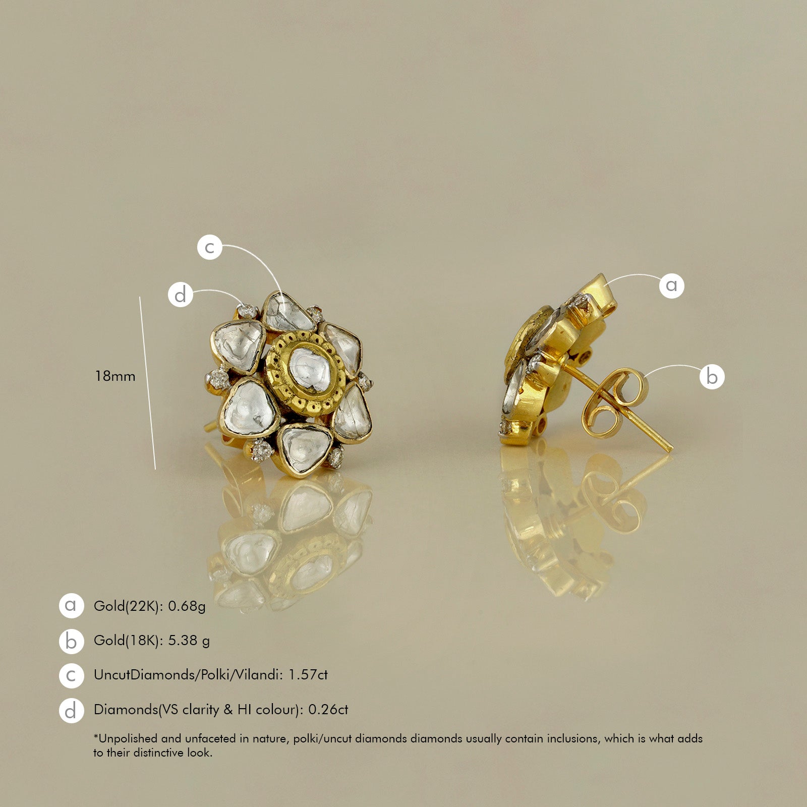 We see Flower of Life as a physical representation of the sacred, the divine, in each of us. Inspired by this form of the sacred geometry, these elegant heirloom ear studs are handcrafted with an natural uncut diamond centre lined with textured gold, surrounded by six bezel-set natural uncut diamond units with six prong-set natural brilliant-cut diamonds alternating them.
