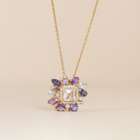 Witness the colours gently drift across a silent night sky. Viola ring channels the quiet wonder of shifting lights that ripple through darkness. At its centre rests a luminous green amethyst, glowing gently like morning frost catching its first hint of colour. An asymmetrical halo of gemstones and natural brilliant-cut diamonds encircles it, sparkling like scattered stars emerging through waves of blue, violet, and soft aquamarine. Crafted in gold, it carries the serenity, mystery, and otherworldly beauty of untouched northern horizons. Made for those who are drawn to vast skies, rare hues, and jewelry that feels almost atmospheric.